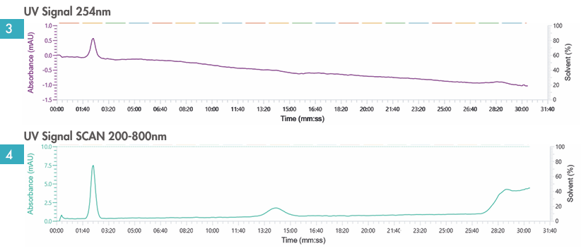 图3与图4:紫外检测下化合物不可见。。。。。。检测初期首波化合物最先展现低强度信号,,,,,但强度缺乏以实现有用网络